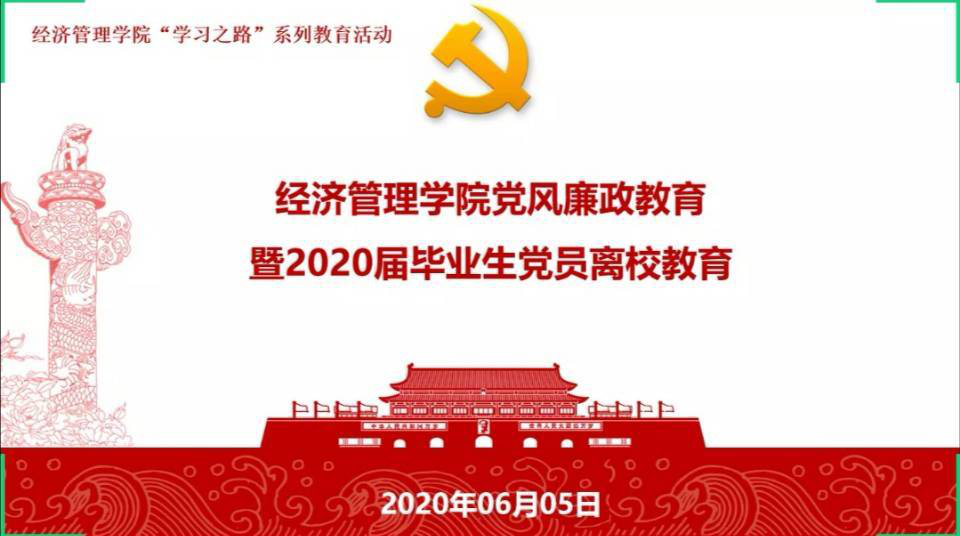 为深入贯彻落实党的十九大精神,落实立德树人根本任务,激励全体毕业党员牢记使命、胸怀祖国、脚踏实地、担当作为,经济管理学院党委于6月6日以线上会议的形式成功举办“2020年党风廉政教育暨毕业生党员离校教育”活动,全体本研200余名毕业生党员参与学习。
