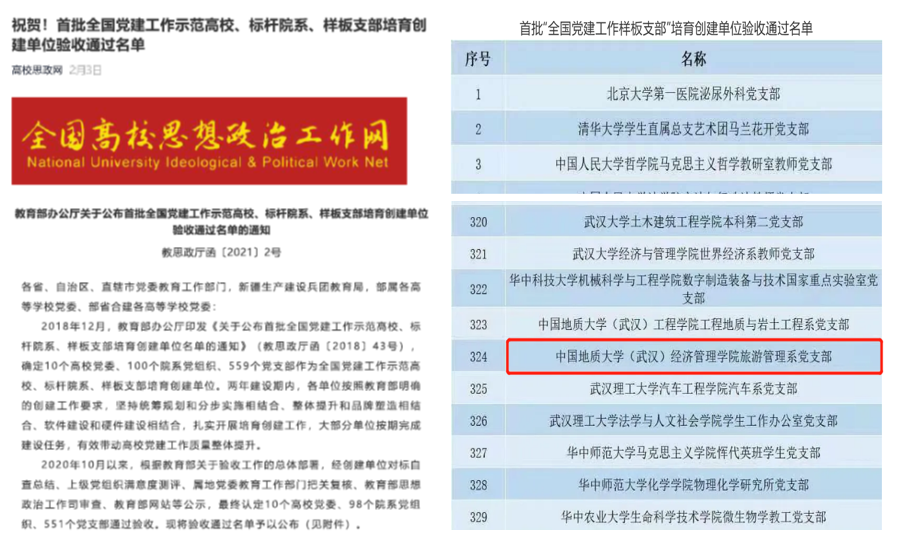 2021年2月3日,教育部发文公布首批全国党建工作培育创建单位验收通过名单,其中,全国党建工作示范高校党委10个、标杆院系党组织98个、样板党支部551个。vwin德赢ac米兰官方网旅游管理系党支部名列验收通过的“全国党建工作样板支部”名单之列,标志着历经两年的培育创建工作取得阶段性成果,迈向支部党建的新征程。