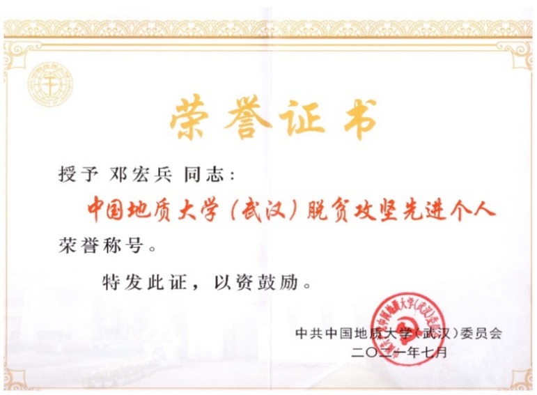 图3邓宏兵教授被授予“vwin德赢ac米兰官方网(武汉)脱贫攻坚先进个人”荣誉证书
