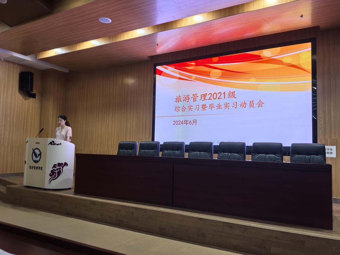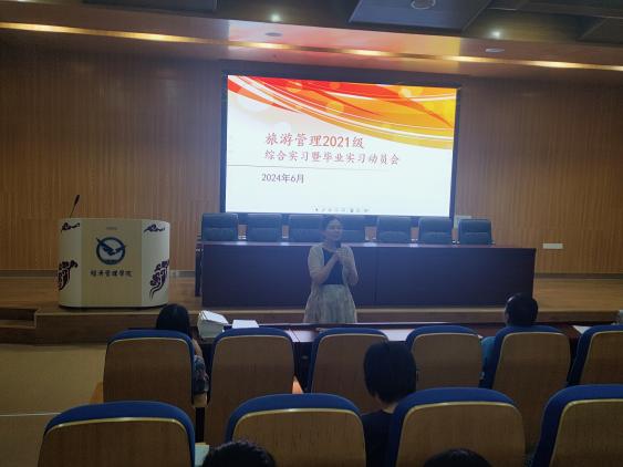 2024年6月19日上午9:00,旅游管理专业在未来城校区经管楼一楼报告厅召开旅游管理2021级综合实习暨毕业实习动员会。旅游管理的系主任李会琴、副主任黄珂、085211班主任柴海燕等7位老师,及旅游管理专业085211班同学参加了此次会议。
