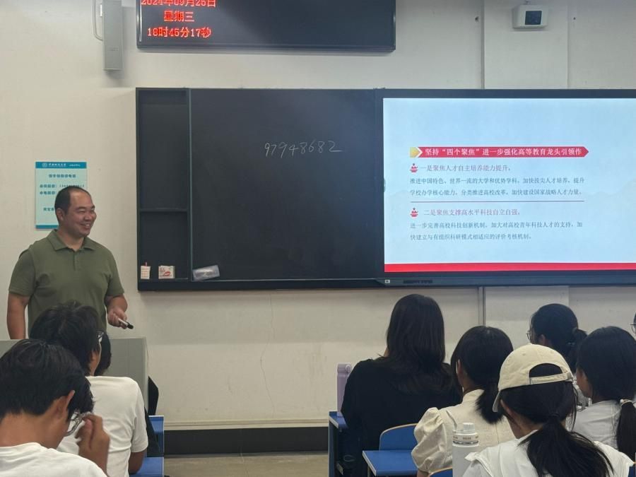 9月24日,学院党委副书记李纪亮于南望山校区为08S245、08S246、08S247三个团支部宣讲了全国教育大会精神,引领同学们深入学习习近平总书记在2024年全国教育大会上的讲话精神。李书记采用生动风趣的讲授方法,结合众多实际案例,详尽阐述了我国教育事业的发展现状以及建设教育强国的紧迫性与重要性。他向同学们讲解了“我们要建成怎样的教育强国”“建成教育强国要依靠怎样的基本路径”等方面问题,带领同学们积极响应和互动。同学们纷纷表示将确立正确的世界观、人生观、价值观,坚守学习初心、砥砺奋进,成为国家与社会所需的优秀人才,与祖国共同实现教育强国梦想。