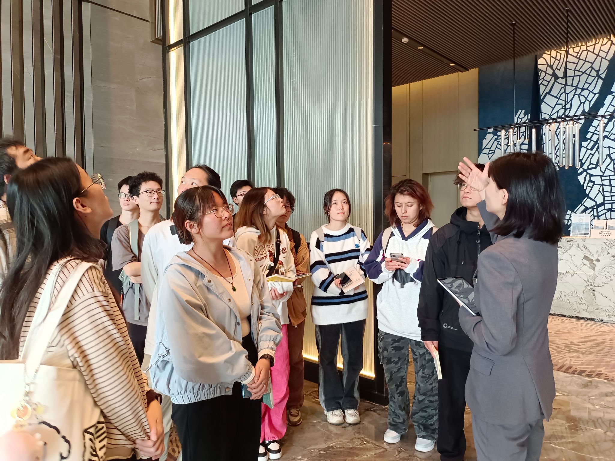 在体验参观环节,贾婷经理和杨惠杰经理向师生们介绍了武汉光谷万豪酒店发展历程,以及酒店建筑理念与艺术中所呈现的文化自信和“执着专注、精益求精、一丝不苟、追求卓越”的工匠精神。在她们的引导下,同学们依次体验了酒店的大堂、餐厅、行政酒廊、总统套房、健身区、多功能会议室等功能空间,沉浸式体验酒店业务运营与服务管理重要环节。