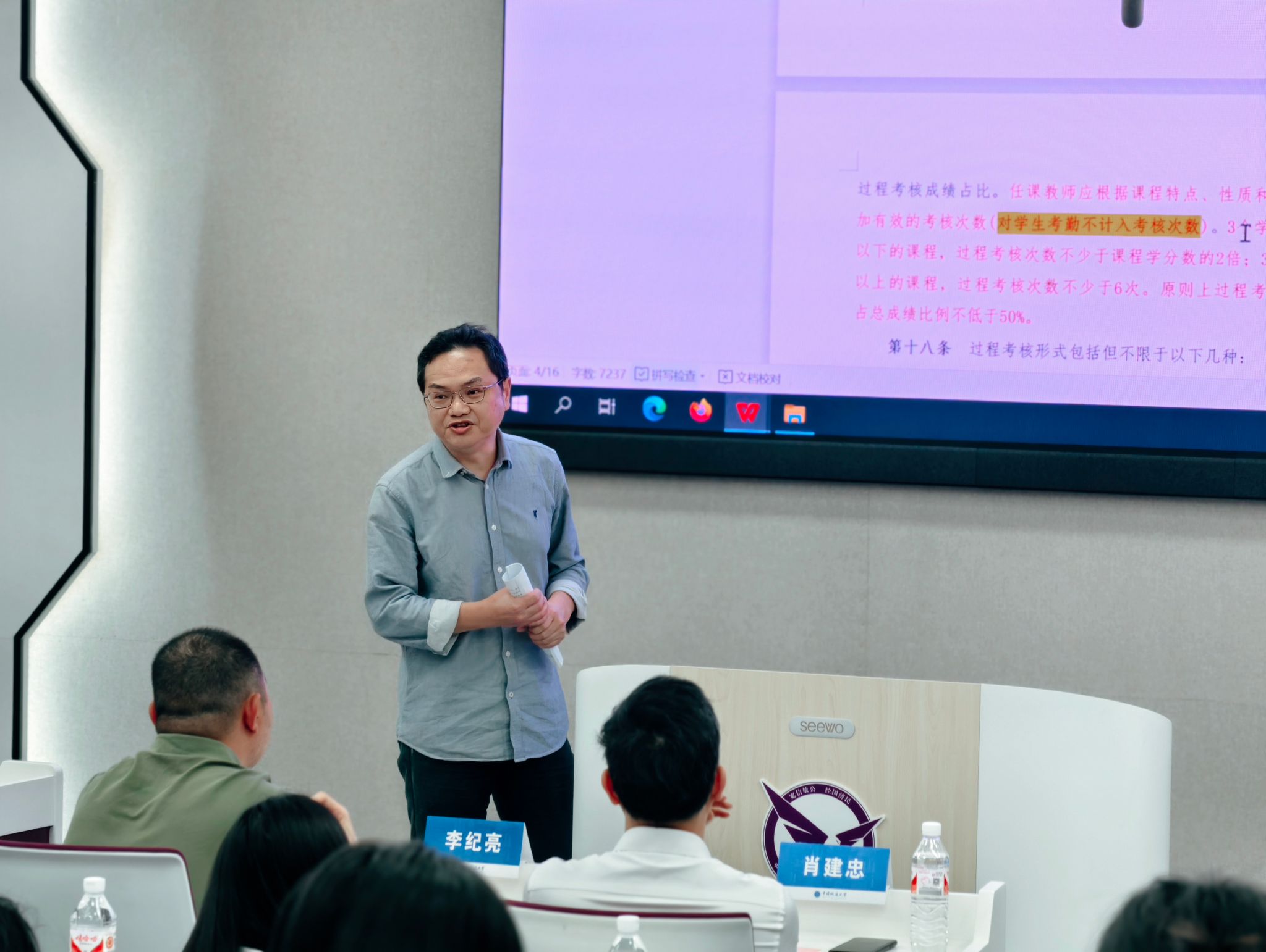 本科生教育办公室主任石磊对学校新修订的《课程修读管理办法》进行了详细解读,重点聚焦于过程考核与结课考试的调整、考勤要求以及缓考管理等内容。石磊老师指出,新办法将过程考核次数与课程学分挂钩,强化学习过程管理和评价,促使学生重视课程学习的持续性和连贯性。过程考核将更加注重对学生学习过程的动态监测和反馈,以确保学生保持积极主动的学习态度和良好学习行为。石磊老师通过班委提醒全体学生应严格遵守管理办法规定,秉持诚信原则参加考试,按时出勤上课维护良好学习风气,注重课程作业提交并重视期末考试,自觉遵守纪律。