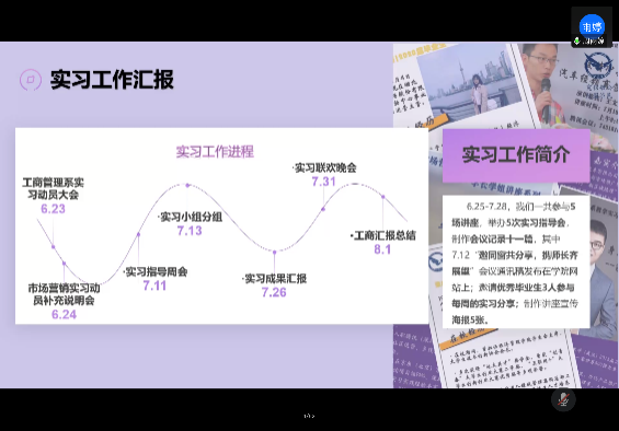 交流会的主要环节为各专业班级同学汇报实习感悟与收获。首先有外国语学院092181班田昊宇、殷梦溪同学分享“互联网背景下华为跨界营销策略分析”为主题开展的小组网络调研实践活动,紧接着是蔡琪、董方黎明小组对其疫情情况下十堰小河村绿松石电商直播营销策略的研究项目进行分享汇报。随后092171班肖丽民、张泽蔚小组对疫情之后消费者购买中药的行为影响因素调研结果进行汇报,该小组呈现出严谨的数据分析特色;来自同班级的王璐晴同学和大家分享了她在袁氏种业高科技有限公司国际贸易部实习过程中,对种子行业的基础了理解以及对中国市场进入海外市场的深度认识。继续为大家分享是来自080181班的覃思静同学,该小组的汇报主题为关于疫情之下直播电商与三大主体的研究,小组三位同学分工明确,合作顺利,收获了宝贵的调研经验;来自同班级的李明洋同学向老师和同学们介绍了他在联想(北京)有限公司人力资源部实习的经验体会,立足于与课本又跳出课本的实践经历弥足珍贵;080182班的王雪同学和冯玫婷同学分别汇报了以河北衡水市王集乡为中心及周边区域发展新型农业电商的可行性调研结果和有着温暖办公氛围的作业帮实习中对“996”的新认识。最后是市场营销专业的汇报,082181的李政嵘同学带来其小组关于盲盒市场现状的调研报告,从文献查找到市场调研层层分析,最后为盲盒行业提出四点建设性的意见;而后,082182的班长周雨婷同学总结市场营销专业的实习概况,计划清晰、有条不紊。