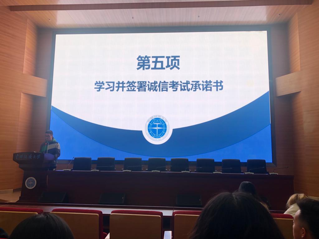 活动的第二项议题是考风考纪诚信教育。努尔老师首先带领同学们学习了《中华人民共和国刑法(修正案九)》中有关考试作弊的规定,呼吁同学们增强守法懂法意识。其次结合我校《vwin德赢ac米兰官方网(武汉)本科课程考核违规处理办法》宣读了违纪行为的认定与处理等相关规定,要求同学们诚信参加任何考试。紧接着,082182班黄浩同学作为学生代表,带领同学们学习《诚信考试承诺书》内容,全体同学签字承诺自觉遵守考核纪律。
