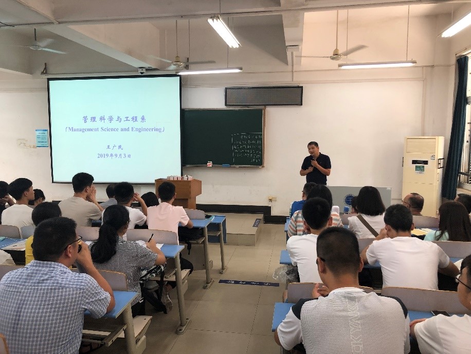 图2: 管理科学与工程系主任王广民老师介绍管科系情况