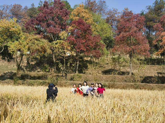 位于国家AAAAA级木兰文化生态旅游核心区内,野村谷景区以乡村效野公园业态闻名。谷内植被茂盛,草木葱郁,曲水流觞,风景布局错落有致,空气清新宜人。园区内广植的银杏、乌桕、红枫等观叶树,被仲秋点染成斑斓秋色,宛如大自然的调色盘。漫步公园内,大家或三五成群,同赏银杏的黄染,与秋意秋色合影;或四六成队,漫看乌桕的红醉,在金黄的稻田中集体留念。