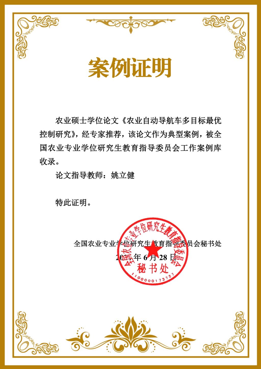经个人申报、学校推荐和全国农业教指委评审,beat365官网光机电学院姚立健教授指导的农业硕士农业工程与信息技术领域方案设计类学位论文《农业自动导航车多目标最优控制研究》入选全国农业硕士典型学位论文案例,该案例被全国农业专业学位研究生教育指导委员会工作案例库收录。
