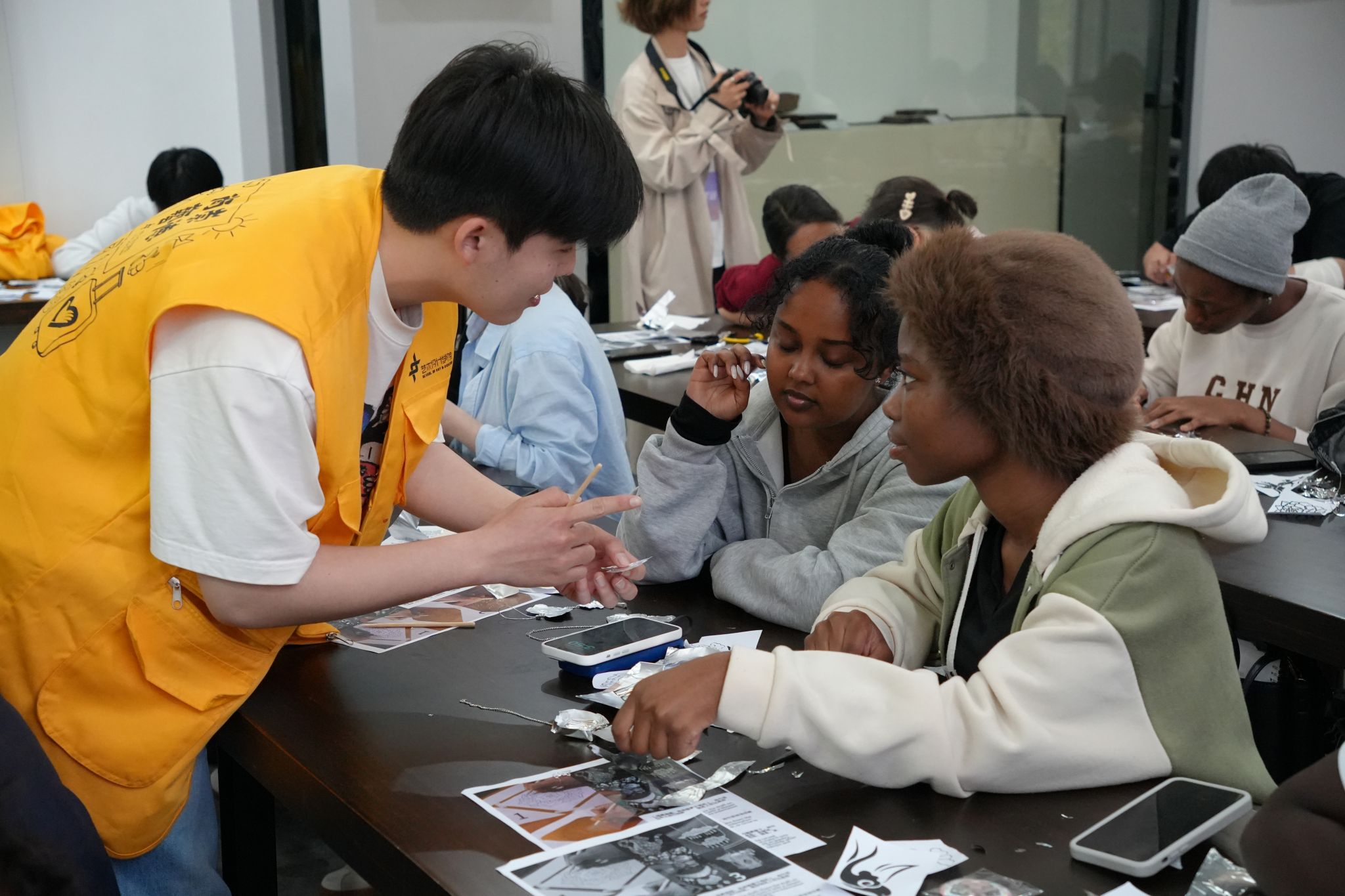 在活动中,畲韵非遗文化传承团队从精美绝伦的银饰工艺讲到独具特色的畲族凤冠文化,从古代畲族的服饰变迁讲到畲族传统节日三月三的由来。中外学生共同体验“一錾一刻”的畲银技艺,积极探索畲族银饰与锡纸艺术的创新结合,通过触觉与视觉的双重感知,深入理解了畲族“以纹载道”的文化内涵。