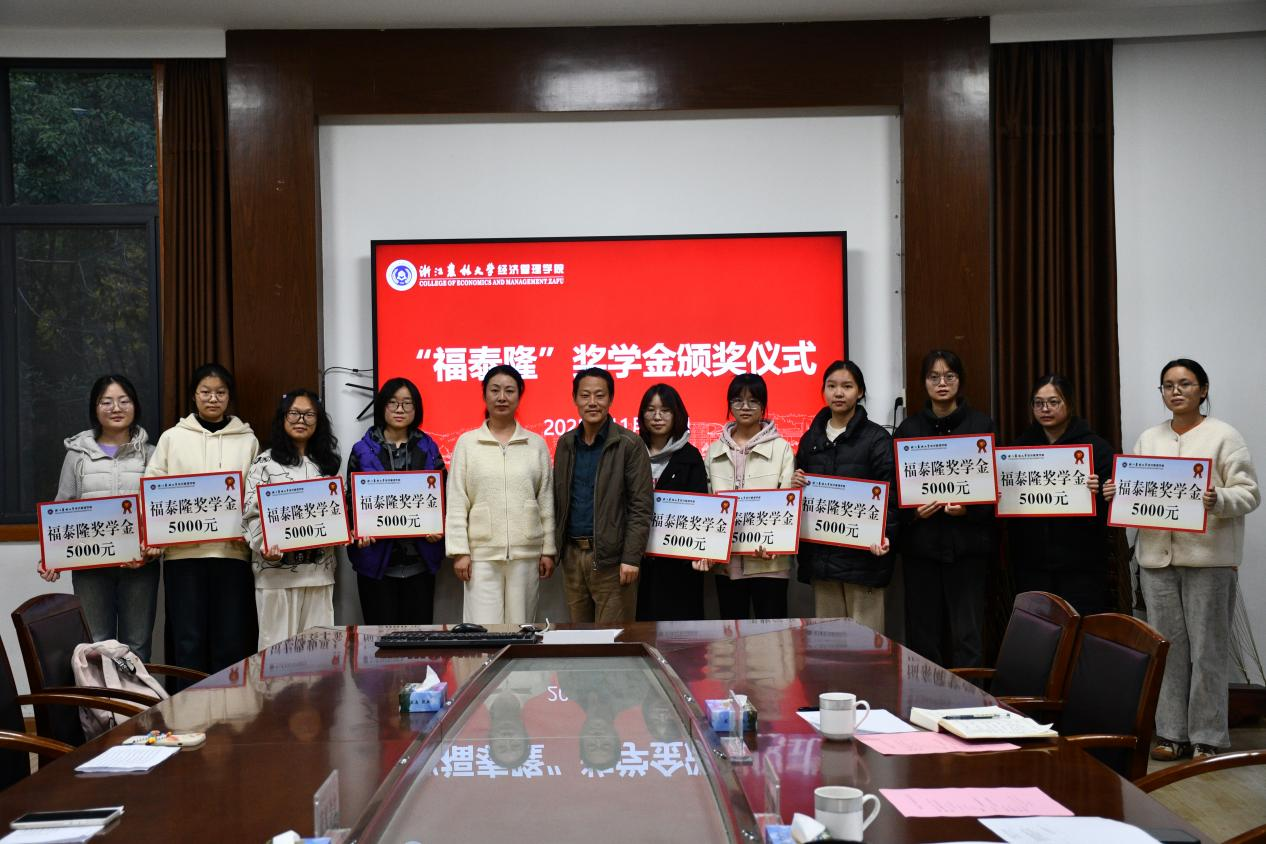 11月27日,“福泰隆”奖学金颁奖仪式在西大楼208会议室举行。浙江福泰隆连锁超市有限公司行政总监唐俊、经管学院党委书记陈劲松、获奖学生代表出席会议。