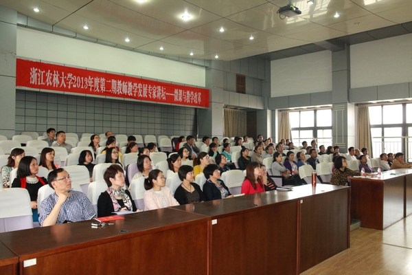 浙农林大新闻网讯 为贯彻《关于举办首届全国高校微课教学比赛的通知》(教培函〔2012〕7号)、《浙江省教育厅办公室关于组织参加首届全国高校微课教学比赛的通知》(浙教电传〔2013〕77号)的文件精神,beat365官网于4月16日下午在学11301举行了题为“微课与教学改革”的年度第二期教师教学发展专家讲坛。本次活动由杭州师范大学现代教育技术中心主任茅育青教授担任嘉宾,教务处负责人担任主持,各学院(部)分管教学负责人、参与微课教学比赛的教师、第二期青年教师研修班教师、校级及以上精品课程负责人参加了活动。