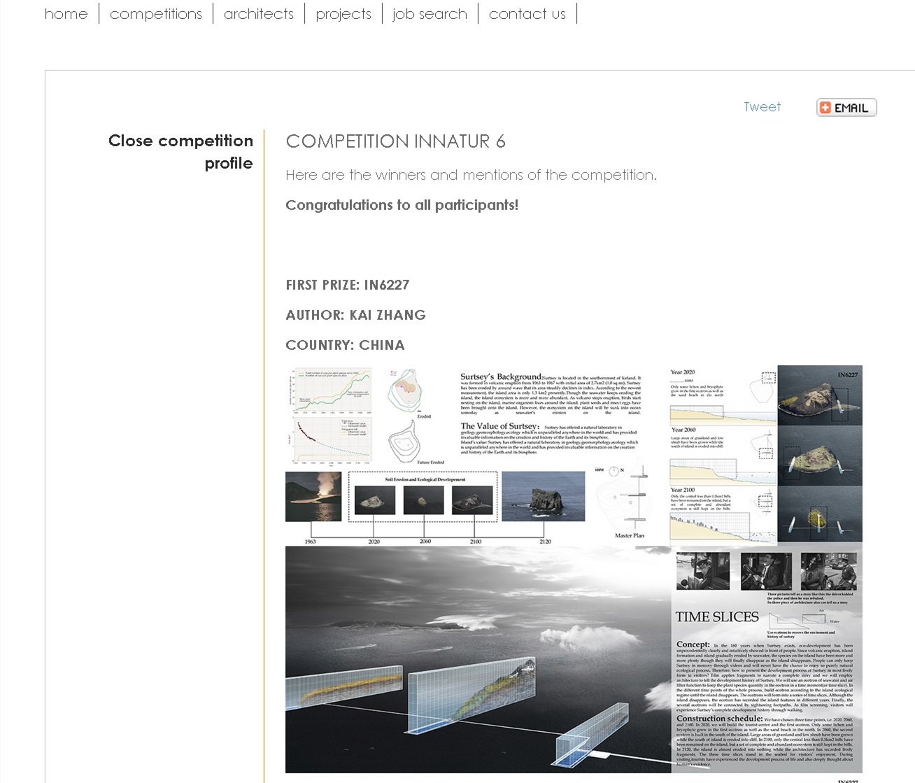 近日,由西班牙OPENGAP机构主办的第六届INNATURE竞赛公布结果。beat365官网建筑学142班张凯同学的作品“TIME SLICES”(时间碎片)荣获一等奖(FIRST PRIZE),这是beat365官网建筑学学科在国际上获得的唯一“一等奖”,是beat365官网建筑学科竞赛的一次重大突破。