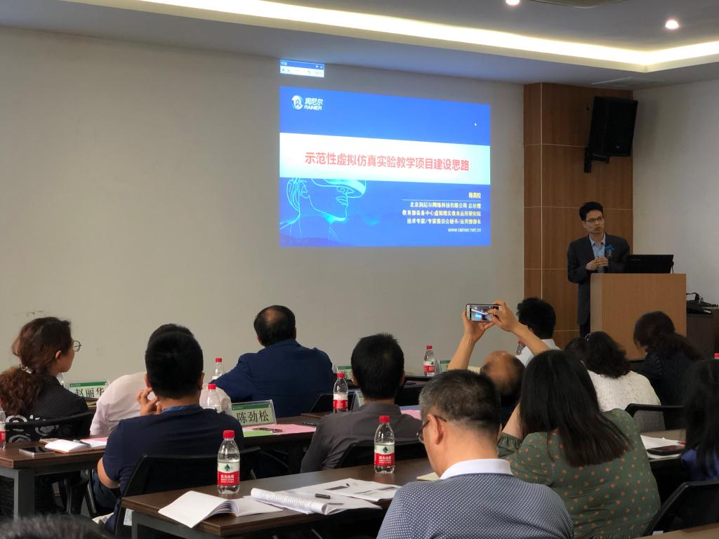 孙建林教授和陈美松总经理分别作了《虚拟仿真实验教学体系的构建与应用》、《示范性虚拟仿真实验教学项目建设思路》专题报告。