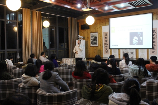 陆洪波以“传递价值,我的精彩我做主”为主题,并结合自身的经历,将社会上茶企业的信息和实战经验与学生们进行了分享。他指出,如今,许多茶文化学生并不完全理解茶文化专业,而实际上“茶”是一种社会交往工具和生活方式。陆洪波围绕“我有价值吗?”、“我的精彩我做主”、“带着课题去实习”、“思想和行为,过程管理”、“学会请求,及时感谢,获得指导和帮助”、“给自己一个阶段性的评价,追求结果”六个方面展开了详细叙述,为在座学生的未来工作、生活提供了实质性的借鉴作用。
