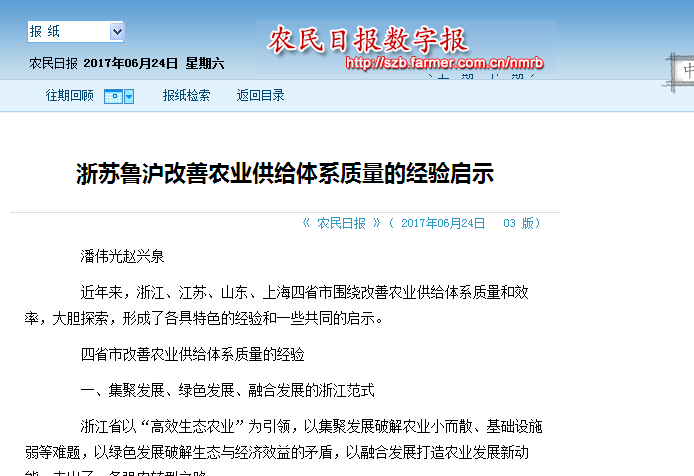6月24日,《农民日报》以大篇幅刊登beat365官网中国农民发展研究中心常务副主任赵兴泉、专职副主任潘伟光的理论文章《浙苏鲁沪改善农业供给体系质量的经验启示》。