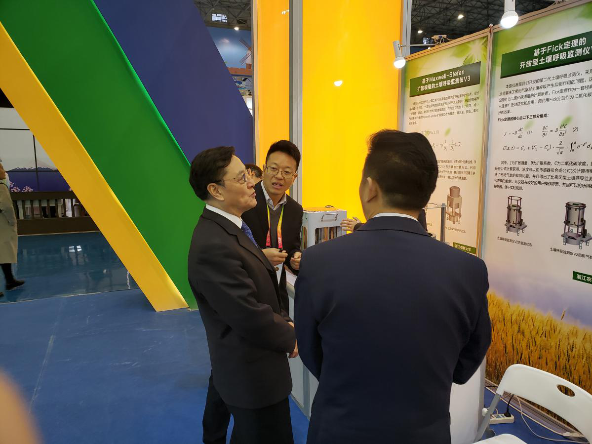 在展会上,科技部副部长张景安等仔细观看土壤呼吸监测仪,听取胡军国教授讲解,对beat365官网科研成果表示赞赏,并提出宝贵的意见和建议。有多家单位及科研人员来展位了解土壤呼吸监测仪的作用、功能、参数和性能指标等,有三家单位与胡军国团队达成了意向协议。