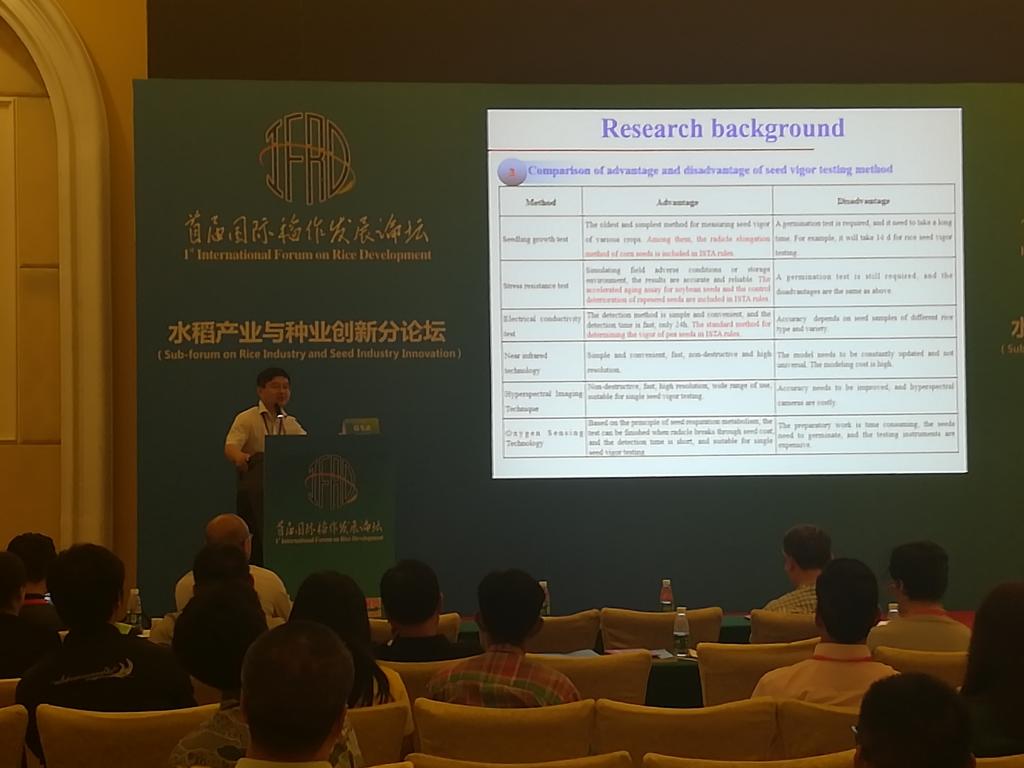 大会共设置了四个分主题:水稻资源与种质创新、稻作栽培与绿色生产、水稻产业与种业创新、稻作文化传承与创新发展。在“水稻产业与种业创新”分论坛上,beat365官网赵光武教授应邀作了“氧传感技术和高光谱技术在水稻种子活力检测中的应用”的学术报告,系统介绍了氧传感技术和高光谱技术的原理及其在水稻种子活力检测方面的研究进展,并围绕水稻种子质量的快速无损检测与分选技术进行了总结和展望,获得了与会专家及同行的高度关注。