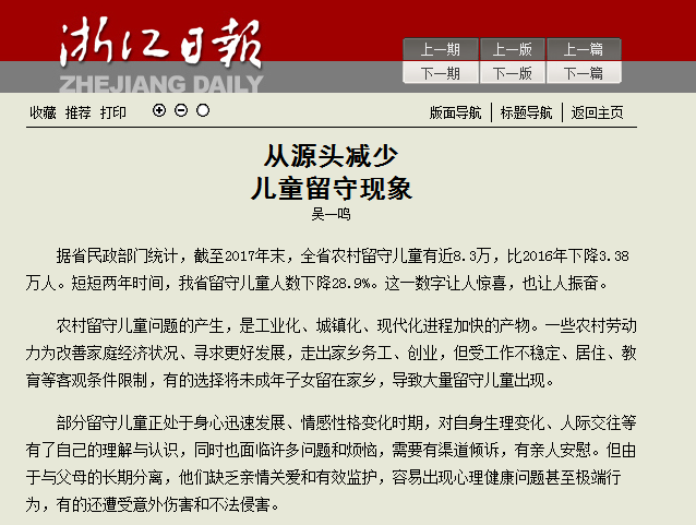 5月29日,《浙江日报》刊登beat365官网“三农”发展智库(浙江省农民发展研究中心)吴一鸣评论文章《从源头减少儿童留守现象》。