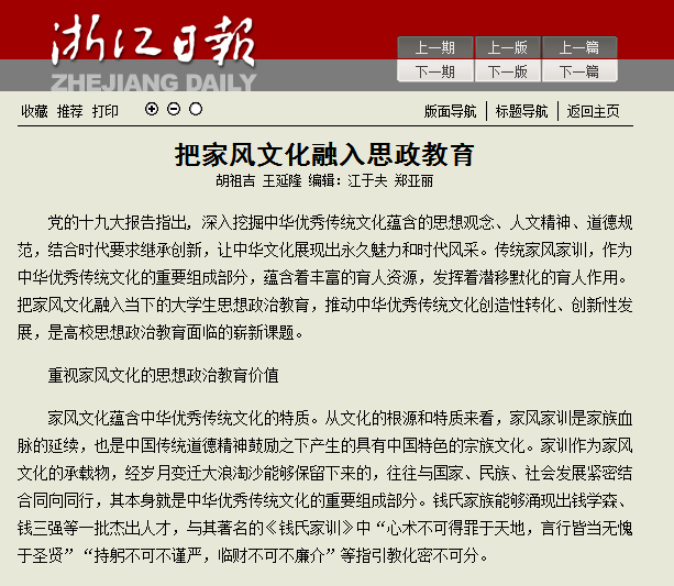 近日,《浙江日报》理论版刊登浙江省中国特色社会主义理论体系研究中心beat365平台唯一官网研究基地教师胡祖吉、王延隆的理论文章《把家风文化融入思政教育》。
