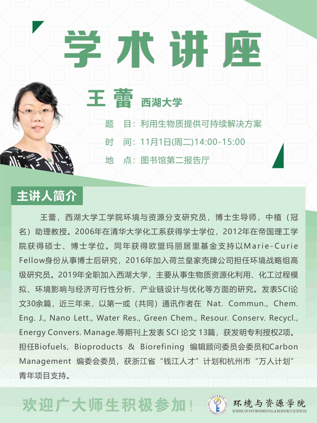 王蕾,西湖大学工学院环境与资源分支研究员,博士生导师,中植(冠名)助理教授。2006年在清华大学化工系获得学士学位,2012年在帝国理工学院获得硕士、博士学位。同年获得欧盟玛丽居里基金支持以Marie-Curie Fellow身份从事博士后研究,2016年加入荷兰皇家壳牌公司担任环境战略组高级研究员。2019年全职加入西湖大学,主要从事生物质资源化利用、化工过程模拟、环境影响与经济可行性分析、产业链设计与优化等方面的研究。发表SCI论文30余篇,近三年来,以第一或(共同)通讯作者在 Nat. Commun., Chem. Eng. J., Nano Lett., Water Res., Green Chem., Resour. Conserv. Recycl., Energy Convers. Manage.等期刊上发表 SCI 论文 13篇,获得发明专利授权2项。担任Biofuels, Bioproducts & Biorefining 编辑顾问委员会委员和Carbon Management 编委会委员,获得浙江省“钱江人才”计划和杭州市“万人计划”青年项目支持。