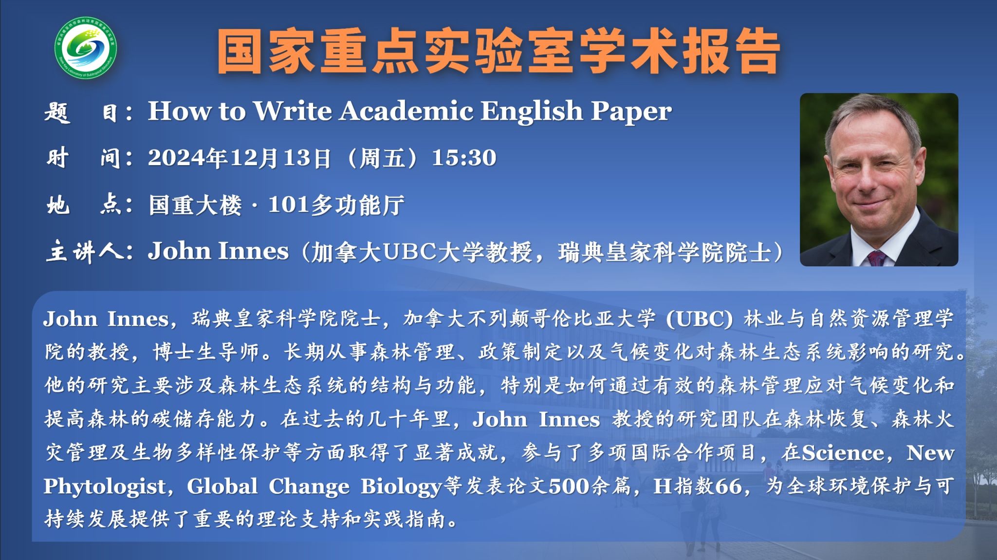 John Innes,瑞典皇家科学院院士,加拿大不列颠哥伦比亚大学 (UBC) 林业与自然资源管理学院的教授,博士生导师。长期从事森林管理、政策制定以及气候变化对森林生态系统影响的研究。他的研究主要涉及森林生态系统的结构与功能,特别是如何通过有效的森林管理应对气候变化和提高森林的碳储存能力。在过去的几十年里,John Innes 教授的研究团队在森林恢复、森林火灾管理及生物多样性保护等方面取得了显著成就,参与了多项国际合作项目,在《Science》、《New Phytologist》、《Global Change Biology》等发表论文500余篇,谷歌H指数66,为全球环境保护与可持续发展提供了重要的理论支持和实践指南。