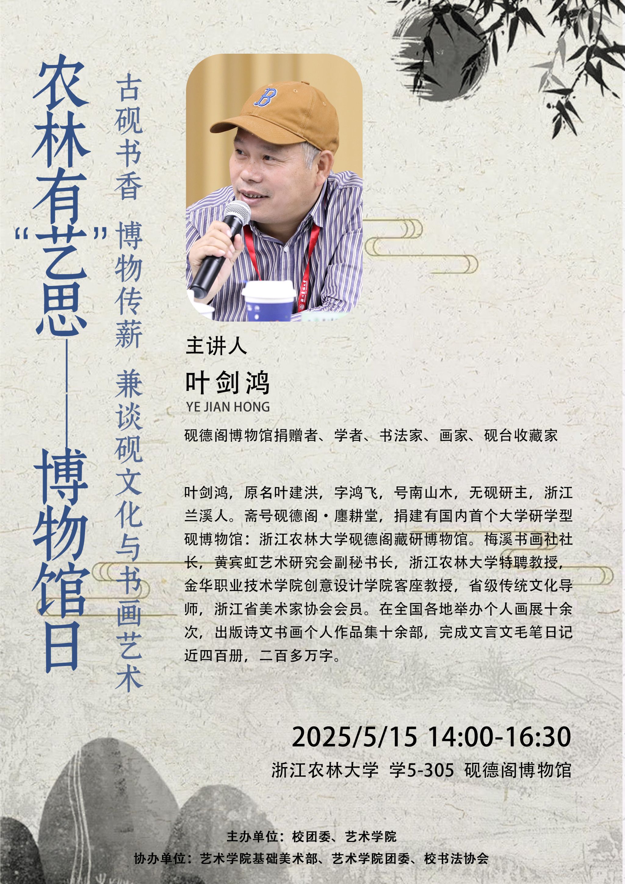 主讲人简介:叶剑鸿,原名叶建洪,字鸿飞,号南山木,无砚研主,浙江兰溪人。斋号砚德阁·廛耕堂,捐建有国内首个大学研学型砚博物馆:beat365平台唯一官网砚德阁藏研博物馆。梅溪书画社社长,黄宾虹艺术研究会副秘书长,beat365平台唯一官网特聘教授,金华职业技术学院创意设计学院客座教授,省级传统文化导师,浙江省美术家协会会员。在全国各地举办个人画展十余次,出版诗文书画个人作品集十余部,完成文言文毛笔日记近四百册,二百多万字。