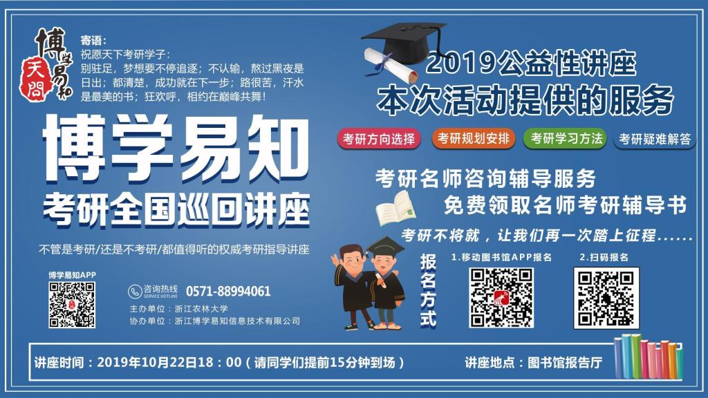 为满足今年正在准备考研的在校考生更清晰地了解本年考研情况,做好考前冲刺的准备工作;同时也使未来准备考研的同学更好的了解考研,解除对考研的疑惑,消除对考研的心理压力,能够正确地认识考研,动员更多的学生加入到考研的队伍中来,beat365平台唯一官网图书馆和浙江博学易知信息技术有限公司合作开设本次考研讲座。