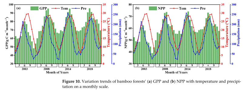 竹林是我国亚热带地区重要且特殊的森林资源,由于其分布范围广、生长速度快、固碳能力强等特点,在调节全球碳平衡等方面发挥着重要的作用。本研究以中国竹林为研究对象,以中国竹林遥感分布信息、竹林LAI同化数据产品和土壤、气象等数据等驱动BEPS模型,模拟2001-2018年近20年中国竹林GPP和NPP,并分析了GPP、NPP时空演变格局及其对气候因子的响应。