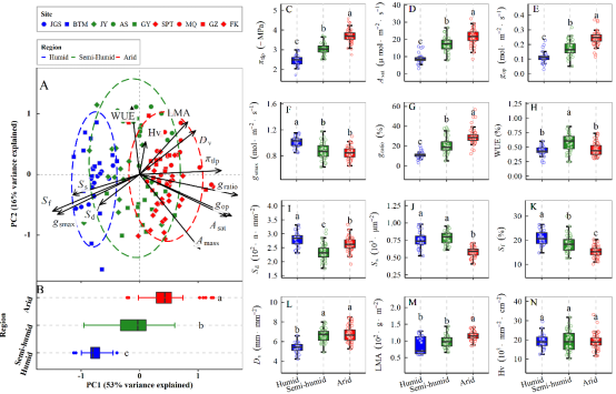 (2)气孔密度和气孔大小在半干旱/半湿润区达到生理阈值(Figs2I, J and 3B, C),意味着气孔密度和气孔大小的调控不足以应对环境胁迫的持续增加。