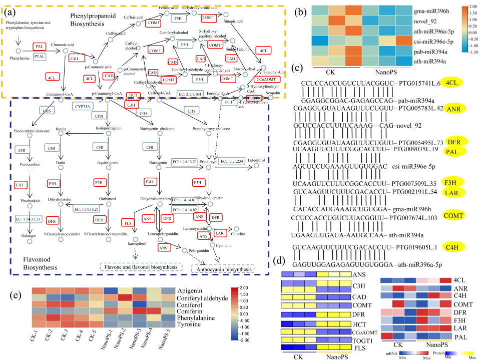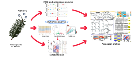 该研究揭示了直径为100nm的聚苯乙烯纳米塑料对香榧幼苗的生理生化和分子水平的反应。纳米塑料促进了硫代巴比妥酸反应物质等的积累,诱导了过氧化氢酶和过氧化物酶等抗氧化酶活性。纳米塑料影响了香榧光合作用,降低铁、硫、锌等元素的体内含量,大量差异代谢物被非靶向代谢组学鉴定。纳米塑料的处理对香榧一系列化学和遗传因子产生重要影响,包括抗氧化剂、小RNA、基因转录、蛋白表达和代谢物的积累。多组学联合分析表明纳米塑料在小RNA、转录、蛋白和代谢水平影响了香榧萜烯类和类黄酮生物合成途径。