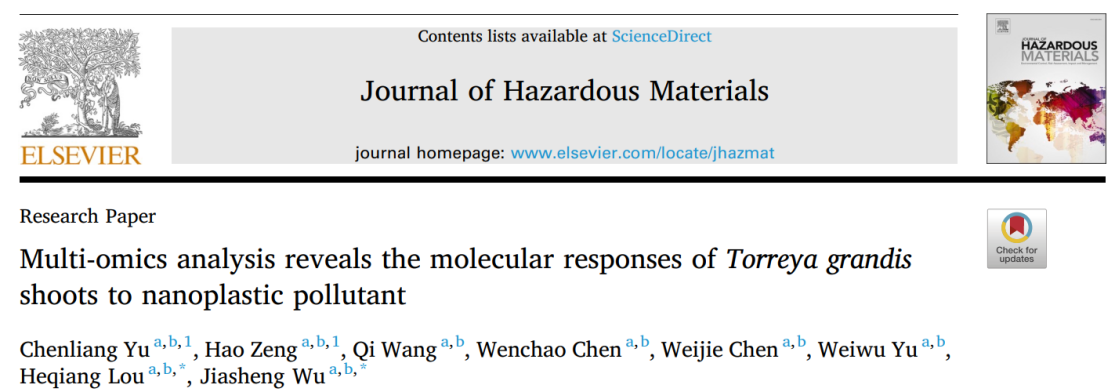 近日,国家重点实验室特色干果团队(吴家胜教授团队)在国际TOP期刊《Journal of Hazardous Materials(危险材料杂志)》(IF=10.588)发表了题为“Multi-omics analysis reveals the molecular responses ofTorreya grandisshoots to nanoplastic pollutant(多组学分析揭示香榧幼苗对纳米塑料污染物的分子响应)”的研究论文。该研究利用多组学联合分析研究了香榧对纳米塑料的反应,揭示萜烯类和类黄酮的生物合成在转录、蛋白和代谢等不同水平受纳米塑料的影响,为森林植物对纳米塑料的反应提供了新的见解。