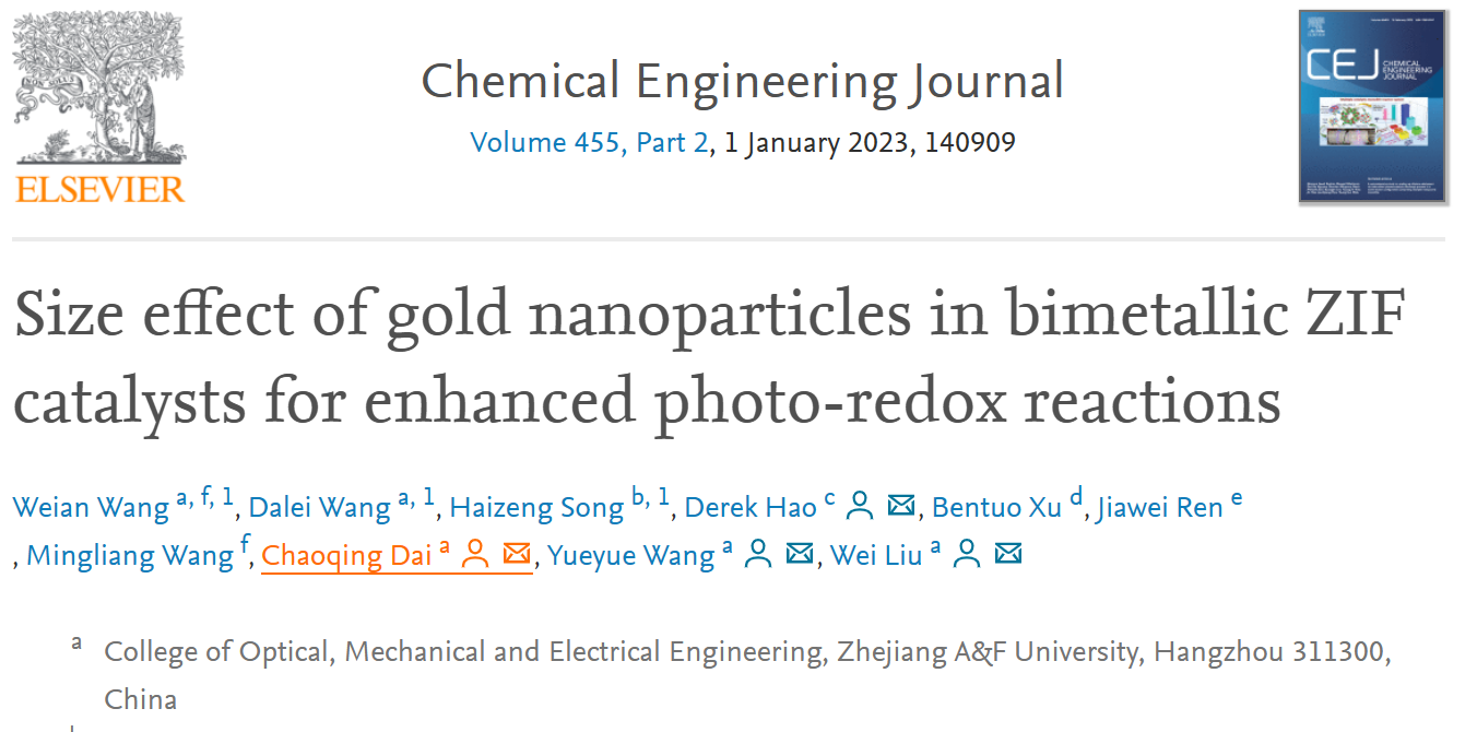 先进光电子应用基础交叉研究中心戴朝卿教授团队以“Size effect of gold nanoparticles in bimetallic ZIF catalysts for enhanced photo-redox reactions”为题于12月12日发表在工程技术领域国际期刊《Chemical Engineering Journal》上(中科院1区,IF=16.744)。这是先进光电子应用基础交叉研究中心筹建以来,将光谱检测应用于农林环境领域,实现工农交叉的重要成果。本文第一单位为beat365平台唯一官网光机电工程学院,通信作者为德国马普所洪堡学者郝强博士,beat365平台唯一官网戴朝卿教授、王悦悦教授、刘威副教授。