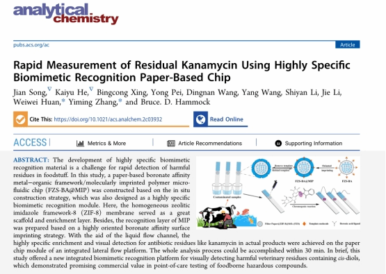 近日,食品与健康学院张宜明教授团队在分析化学领域国际知名期刊Analytical Chemistry(《分析化学》)(ACS,中科院1区TOP,IF2021 = 8.008)发表题为“Rapid Measurement of Residual Kanamycin Using Highly Specific Biomimetic Recognition Paper-Based Chip”(《高特异性仿生识别纸基芯片快速测定卡那霉素残留》)的论文,并成功入选当期Supplementary Cover Art(附件封面)。这是团队指导本科生漏忆雯在Microchemical Journal(《微化学杂志》)上发表一作“Lateral flow analysis of Pb (II) in green tea integrated with ionic imprinted paper-based chip”(《离子印迹纸基芯片侧流分析绿茶中的铅Pb (II)》)之后纸基微流控研究方向更重要的一项阶段性成果。
