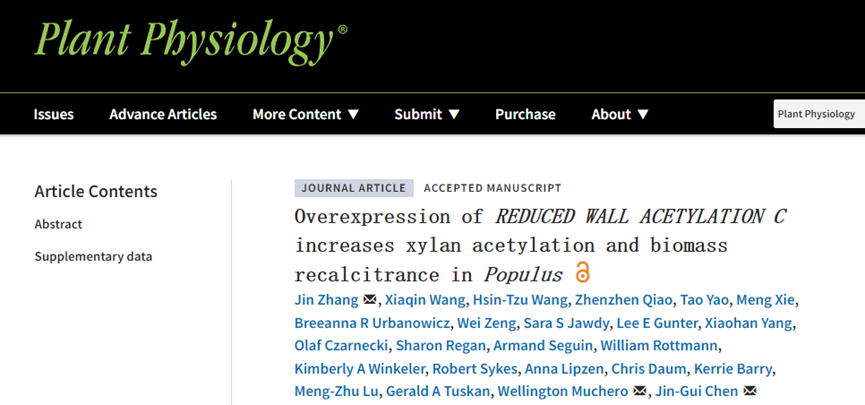 近日,国家重点实验室林木木材品质研究团队张进教授在植物学领域著名期刊《Plant Physiology》在线发表了题为Overexpression ofREDUCED WALL ACETYLATION Cincreases xylan acetylation and biomass recalcitrance inPopulus的研究论文。该研究揭示了细胞壁木聚糖乙酰化影响杨树生物质能源转化效率的新机制。