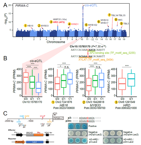 A.eQTL分析发现PtRWA-C基因在木质部的表达受强烈的cis-eQTL和trans-eQTL调控;B.cis-eQTL和trans-eQTL在不同基因型之间对PtRWA-C基因表达的影响;C.利用酵母单杂明确转录因子HRD对PtRWA-C的调控依赖于cis-eQTL的关键位点