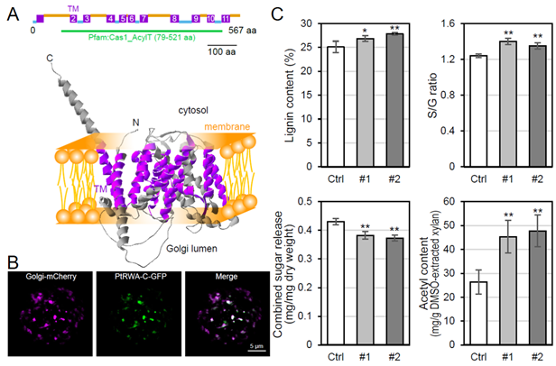 A.PtRWA-C蛋白结构预测;B.PtRWA-C蛋白定位于高尔基体上;C.过表达PtRWA-C基因导致杨树细胞壁木聚糖乙酰化水平升高、木质素含量及木质素单体S/G比率升高、细胞壁糖释放效率降低