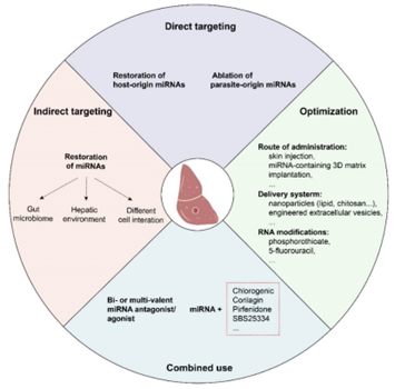 由于miRNAs在寄生虫感染诱导的肝纤维化中发挥重要功能,所以可利用病毒和非病毒递送系统,作用于那些直接参与纤维化的miRNAs,抑制HSC的活化,促进纤维化消退;同时,也可靶向与肠道菌群、肝脏微环境和肝脏不同细胞间互作相关的miRNAs,研制新型抗纤维化药物。为了获得更好的药效,需要研制二价或多价miRNA药物,也可联合使用miRNA药物和其他抗纤维化蛋白或化学药物。在此基础上,通过优化递送系统、给药途径及RNA修饰等,再进一步提高抗肝纤维化miRNA药物的疗效。