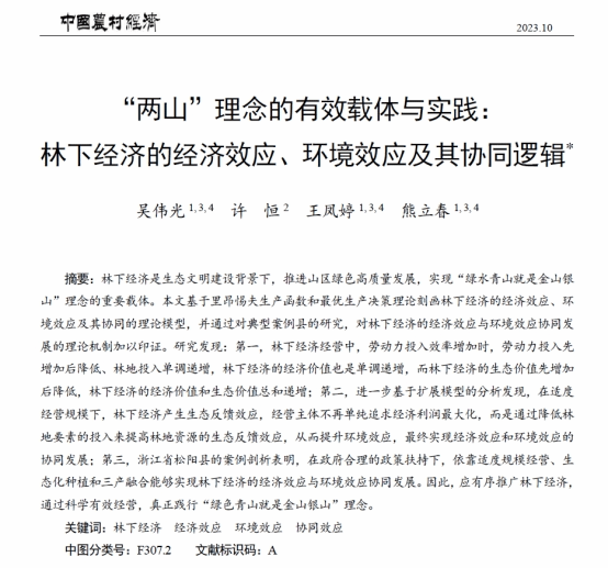 近日,经济管理学院吴伟光教授团队的研究论文《“两山”理念的有效载体与实践:林下经济的经济效应、环境效应及其协同逻辑》在知名期刊《中国农村经济》2023年第10期发表。中国政法大学商学院许恒副教授为第二作者,beat365平台唯一官网浙江省乡村振兴研究院研究人员王凤婷博士为第三作者,beat365平台唯一官网生态文明研究院熊立春副教授为通讯作者。