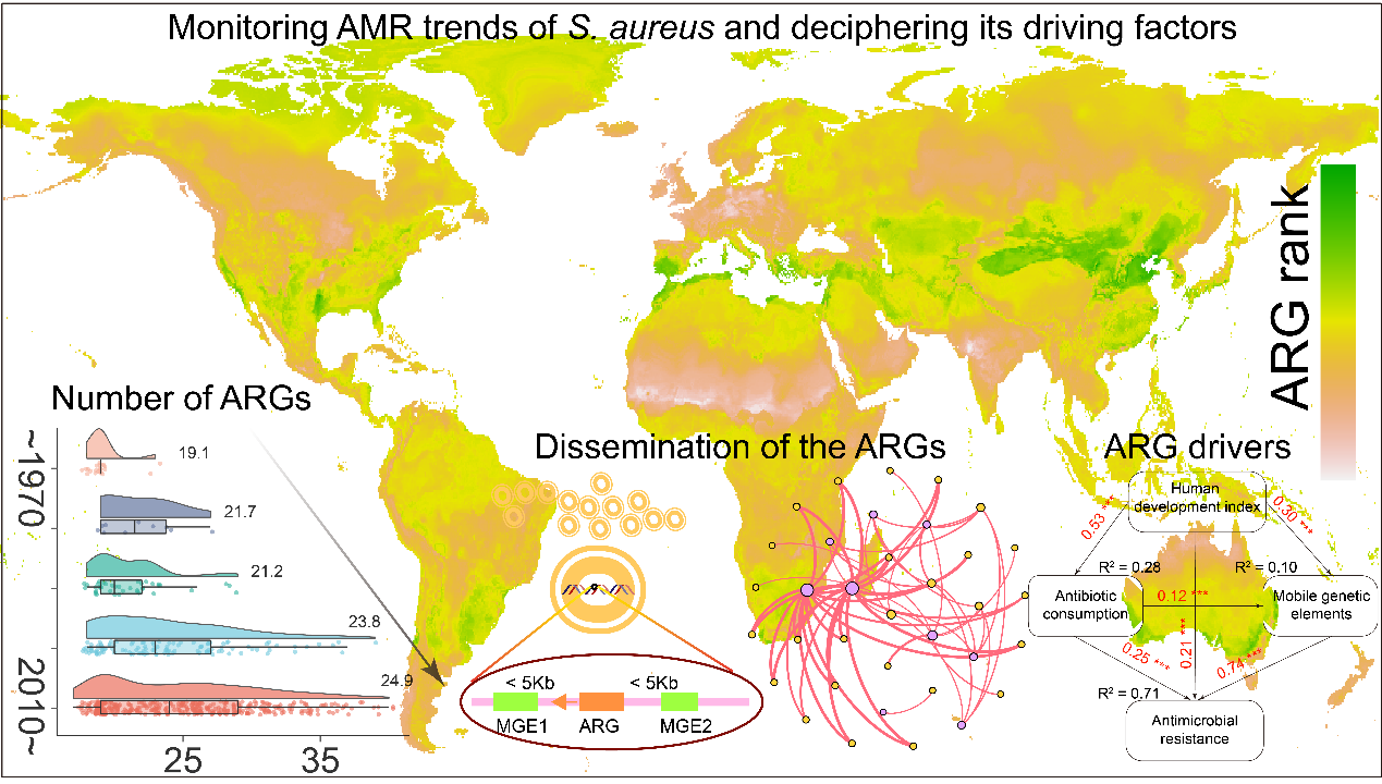 该论文探究了100多年来全球食源性致病菌—金黄色葡萄球菌(Staphylococcus aureus)耐药基因的进化的驱动因素及传播机制。beat365平台唯一官网食品与健康学院方冠宇老师为论文的第一作者和通讯作者,刘兴泉教授为文章的通讯作者。