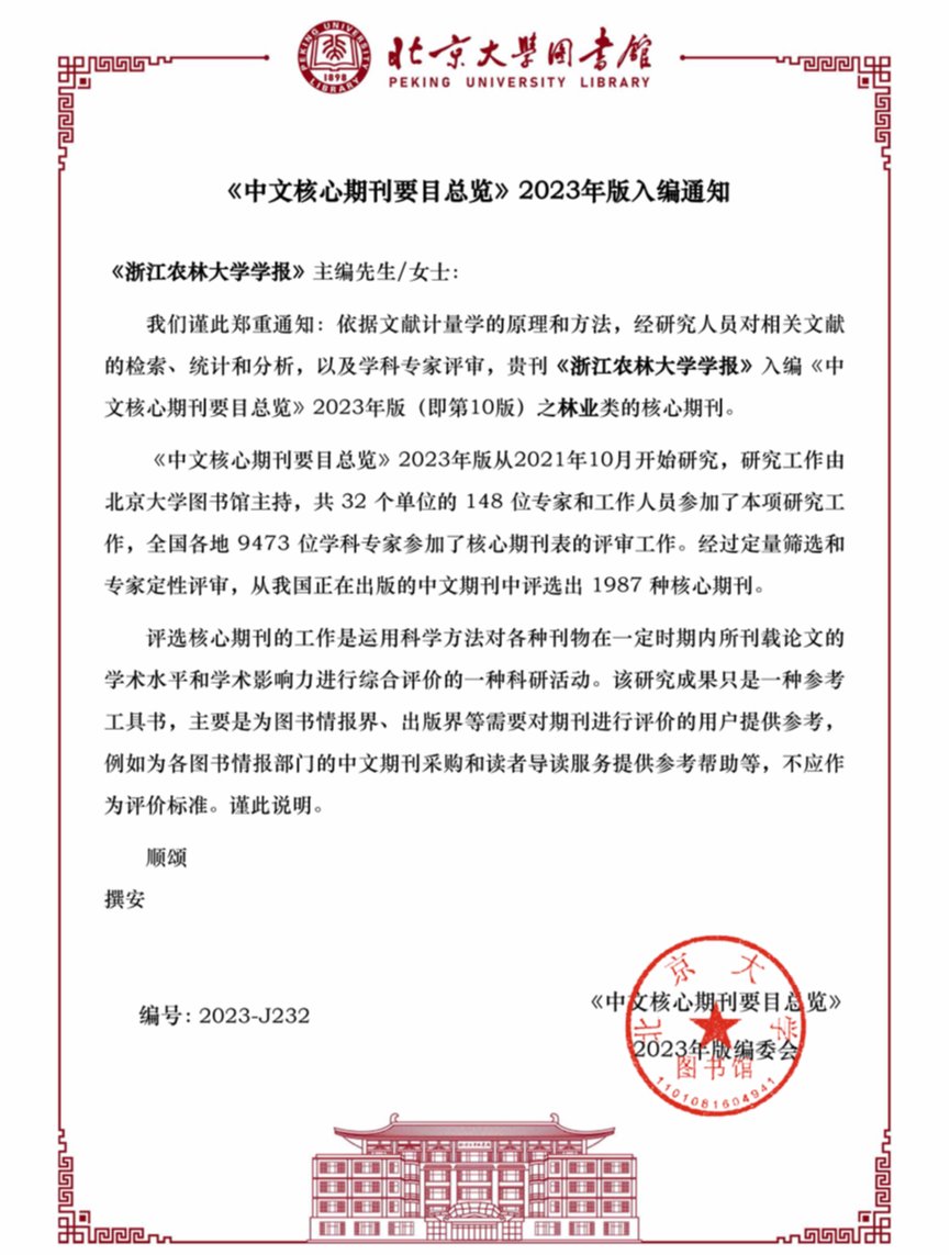 近日,《beat365平台唯一官网学报》入编《中文核心期刊要目总览》2023年版(即第10版)之林业类的核心期刊。这是本刊连续第十次被《中文核心期刊要目总览》列为全国中文核心期刊。