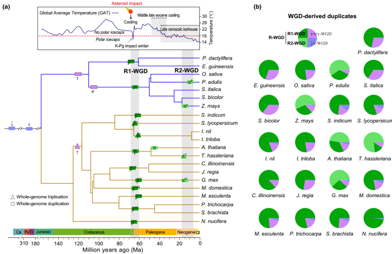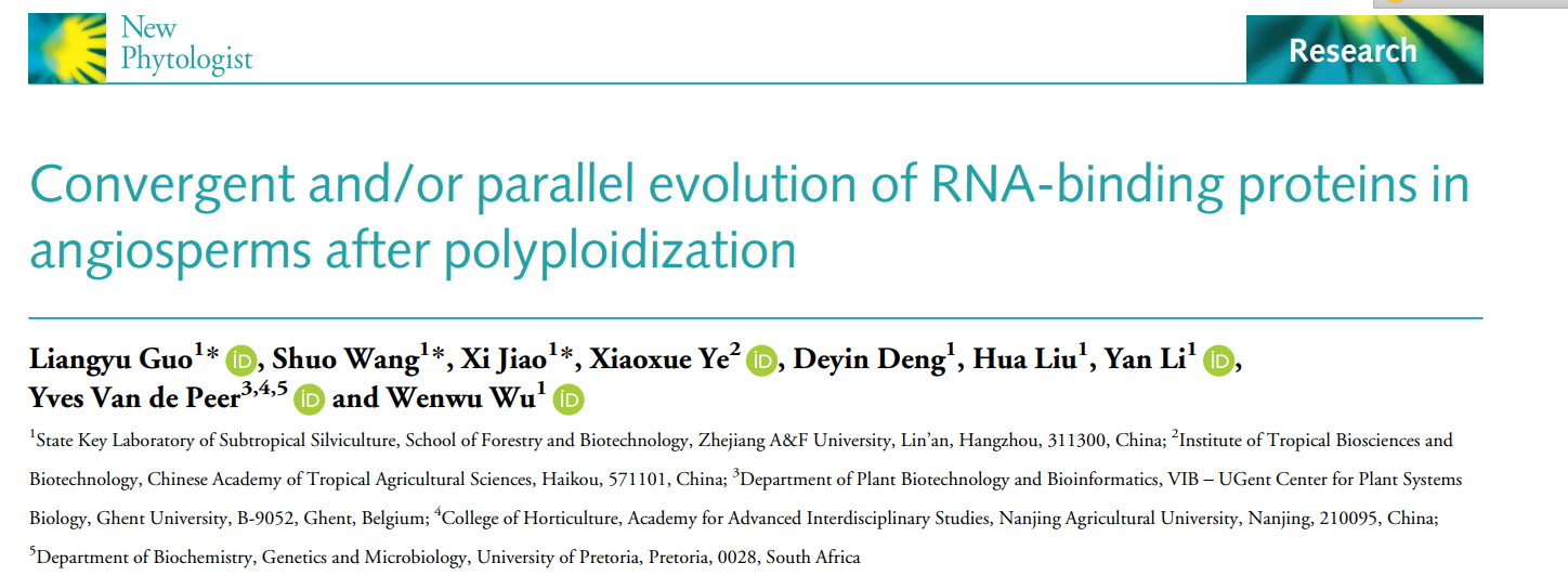 近日,beat365平台唯一官网国家重点实验室李彦、吴文武教授与比利时根特大学Yves Van de Peer院士联合在《New Phytologist》(中国科学院1区Top,IF5-yr=10.5)上发表了题为“Convergent and/or parallel evolution of RNA-binding proteins in angiosperms after polyploidization”(被子植物多倍化后RNA结合蛋白的趋同或平行进化)的研究论文。该研究主要基于拟南芥、毛果杨、苹果、番茄、大豆、山核桃、水稻、玉米、毛竹、棕榈等21个代表性被子植物,结合基因组学、转录组学、调控组学以及古气候学研究数据,揭示了在WGD后被子植物RBP基因趋同进化以适应K-Pg和晚新生代冰期的全球大降温。