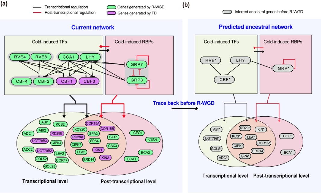 图2.昼夜节律和低温调控网络在R-WGD后的重塑和升级模式图