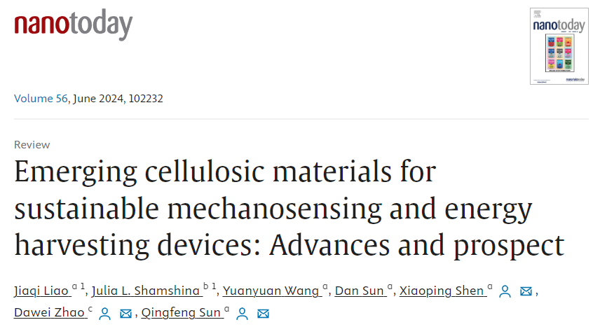 3月14日,林业工程学科生物质仿生智能研究团队在材料科学领域国际期刊《Nano Today》(中科院1区,IF=17.4)在线发表题为《用于可持续机械传感和能量收集装置的新兴纤维素材料:进展与前景》(Emerging cellulosic materials for sustainable mechanosensing and energy harvesting devices: Advances and prospect)的综述论文。第一作者是该团队硕士研究生廖嘉棋,通讯作者为beat365平台唯一官网沈晓萍副教授和孙庆丰教授,合作作者包括美国得克萨斯理工大学Julia L. Shamshina助理教授和沈阳化工大学赵大伟教授。beat365平台唯一官网化学与材料工程学院为该论文第一单位和通讯作者单位。