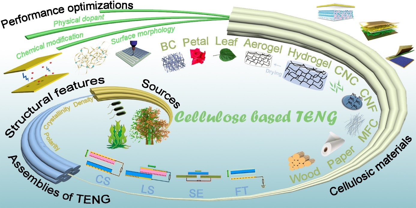 该综述论文全面总结了近年来基于摩擦纳米发电效应的纤维素基机械感受和能量存储器件(Cellulosic materials for sustainable mechanosensing and energyharvesting devices)的研究进展和展望,系统提供了目前主流的纤维素基纳米摩擦电器件汇编,涵盖了从组成和加工到优化和应用的各方面研究(图1),重点阐释了基于摩擦电效应的新型纤维素基离电智能材料的内在作用机制和性能提升策略。