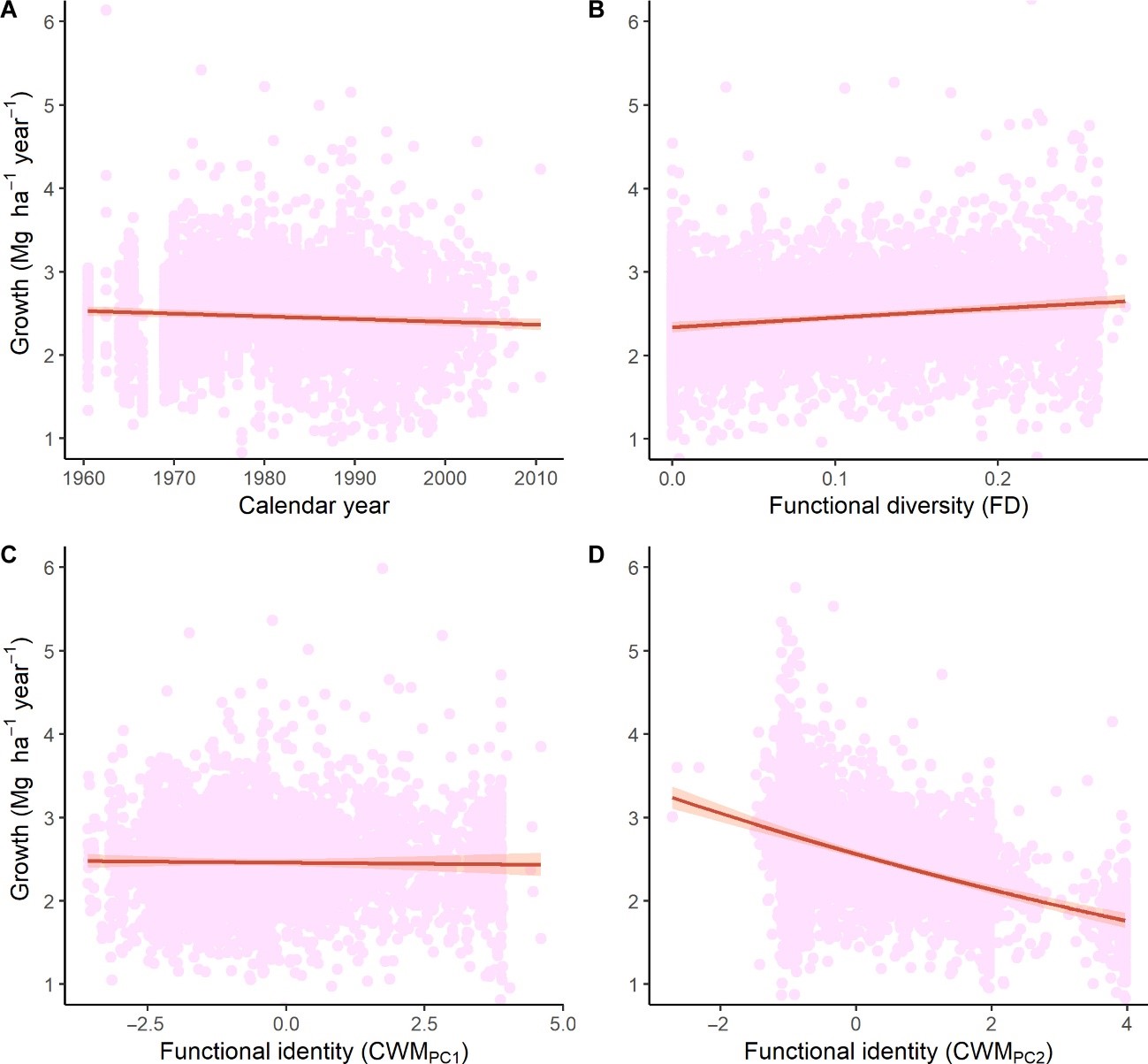 基于此,陈信力教授与多位国际学者合作,通过分析2491个森林样地超过57年的数据,探讨了树木功能多样性和功能性状对森林生产力在面对环境变化时的影响。研究发现,尽管干旱地区森林生产力因水分下降的压力而普遍下降,具有较高功能多样性的森林却能维持相对较高的生产力水平,而功能多样性较低的森林生产力下降更显著。此外,具有资源获取型特征的森林可以从气候变暖中受益,而具有耐旱特征的森林对干旱表现出更好的抵抗能力。该研究表明,促进森林的功能多样性可以增强其对气候变化的适应能力和韧性。通过了解树木物种的功能性状,森林管理策略可以优先选择能够耐受或从变化的环境条件中受益的物种,这对于促进森林生态系统应付气候变化的长期可持续性至关重要。