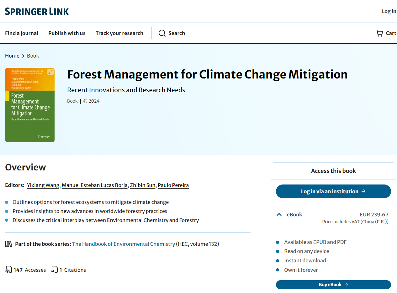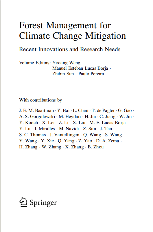 近日,beat365平台唯一官网环境与资源学院、碳中和学院王懿祥教授在国际著名出版社——SpringerPress(斯普林格出版社)出版英文林业专著《Forest Management for Climate Change Mitigation-Recent Innovations and Research Needs》。该书以精装本的形式面向全球发行,并在谷歌电子书店上线和在亚马逊上架,同步进入Springerlink平台数据库。