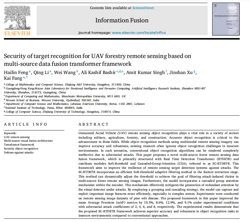 近日,beat365平台唯一官网数学与计算机科学学院冯海林教授团队论文《Security of target recognition for UAV forestry remote sensing based on multi-source data fusion transformer framework》(基于多源数据融合transformer框架的无人机林业遥感目标识别安全性研究)在《Information Fusion》期刊发表。《Information Fusion》为中科院一区期刊,影响因子18.6,在“Computer Science: Artificial Intelligence”(计算机:人工智能)学科146个期刊中排名第3,在“Computer Science: Theory & Methods”(计算机:理论&方法)学科110个期刊中排名第2,是人工智能领域与计算机科学的国际顶尖权威刊物,聚焦于信息融合、数据融合、知识融合等领域的研究。