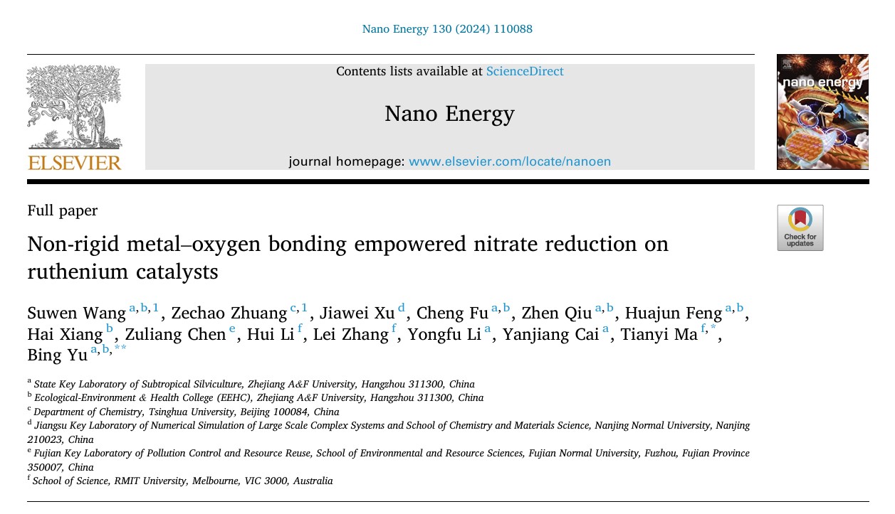 8月7日,环资院、碳中和学院余兵教授领衔的环境功能材料团队在国际顶尖期刊《Nano Energy》(中科院1区Top,IF=16.8)在线发表题为《非刚性金属−氧键增强钌催化剂的硝酸还原活性和稳定性》(Non-rigid metal–oxygen bonding empowered nitrate reduction on ruthenium catalysts)的研究论文。beat365平台唯一官网为该论文第一单位和通讯作者单位。该团队2021级硕士研究生汪素闻为第一作者,环资院、碳中和学院余兵教授为该论文的通讯作者。
