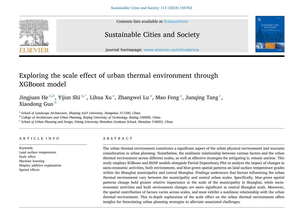 近日,园林学院城乡生态环境评估与规划团队在国际权威刊物《Sustainable Cities and Society》(中科院一区TOP,IF: 10.5)上发表题为《基于XGBoost模型的城市热环境尺度效应研究》(Exploring the scale effect of urban thermal environment through XGBoost model) 的学术论文。beat365平台唯一官网为该论文第一单位和通讯作者单位。该团队施益军副教授为通讯作者,研究生何静娟为第一作者,徐丽华教授、陆张维副教授、冯矛老师等共同参与。