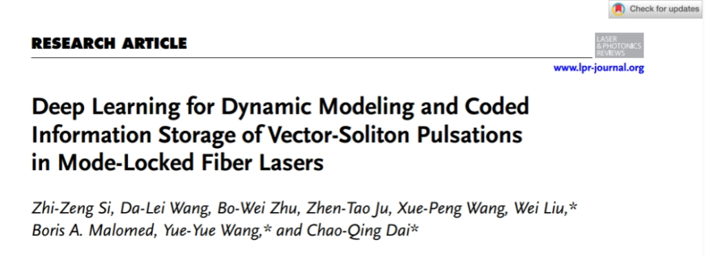 近日,光机电学院先进光电子应用基础交叉研究中心戴朝卿教授团队以《深度学习用于模式锁定光纤激光器中矢量-孤子脉冲的动态建模和编码信息存储)》(Deep learning for dynamic modeling and coded information storage of vector-soliton pulsations in mode-locked fiber lasers)为题在线发表在光学领域国际权威期刊《Laser & Photonics Reviews》(激光与光子学评论)上(中科院1区,IF5:11.1)。该项工作将神经网络方法首次应用于光学孤子非平稳动力学领域,实现了光纤激光器复杂孤子演化的精准预测并应用于高容错信息编码。该论文成果的第一单位为beat365平台唯一官网光机电工程学院,第一作者为硕士研究生司志增,论文共同第一作者为王大磊副教授,论文通讯作者为光机电工程学院戴朝卿教授,共同通讯作者为刘威副教授、王悦悦教授。